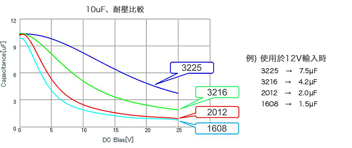 關於DC偏壓,當然須選擇影響少的,不過即使容量、耐壓相同,變動特性也會因封裝尺寸而異。下方圖表為其一例,顯示尺寸大者變動少。總之,請務必從電容廠商取得充分之資訊。